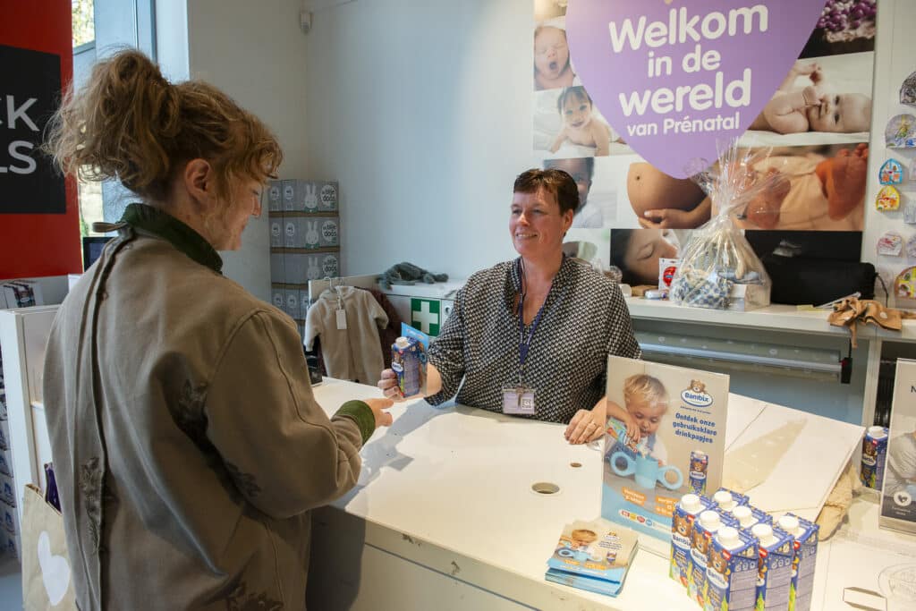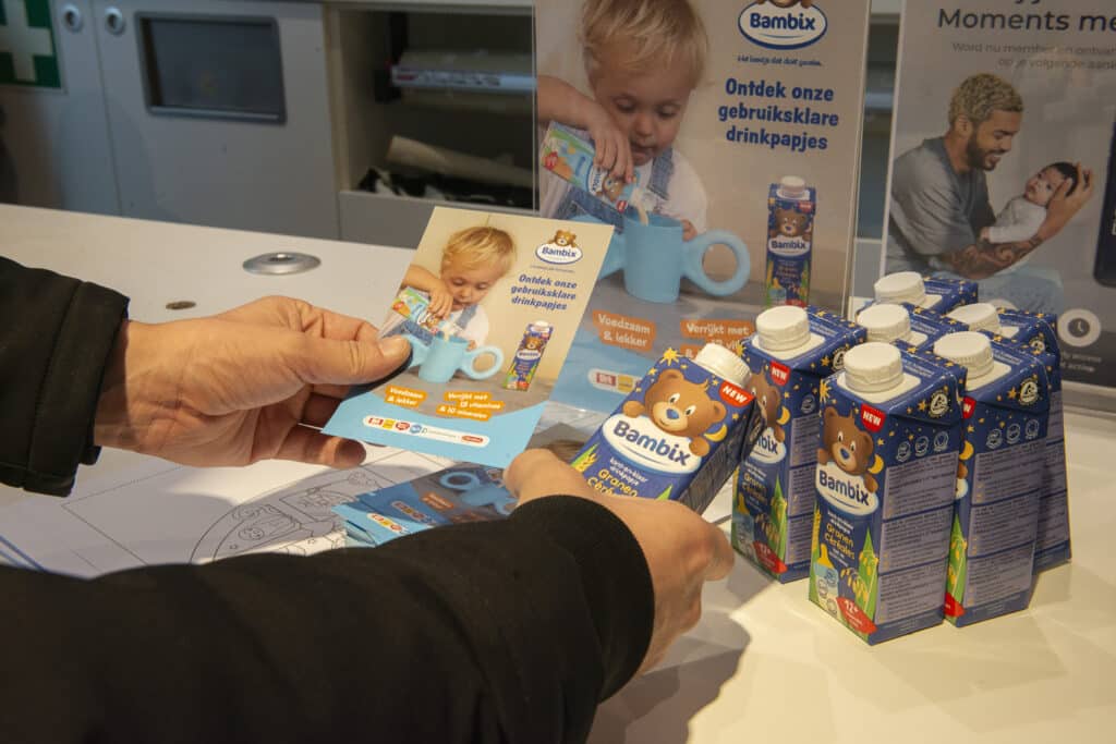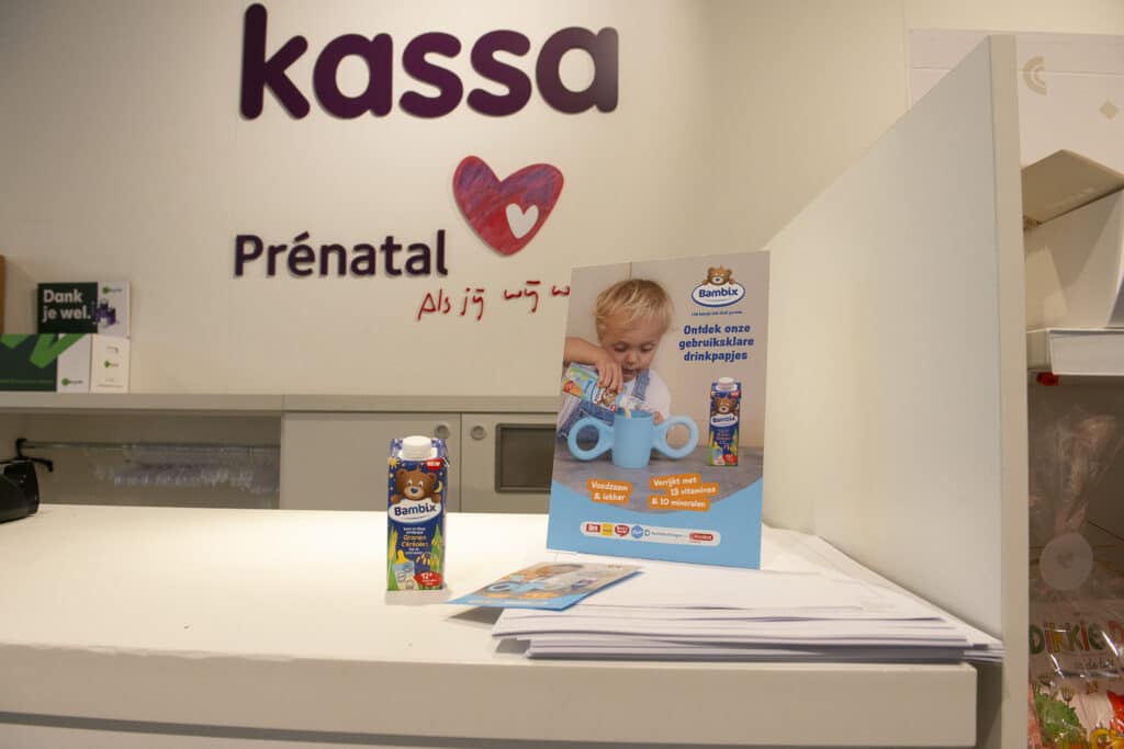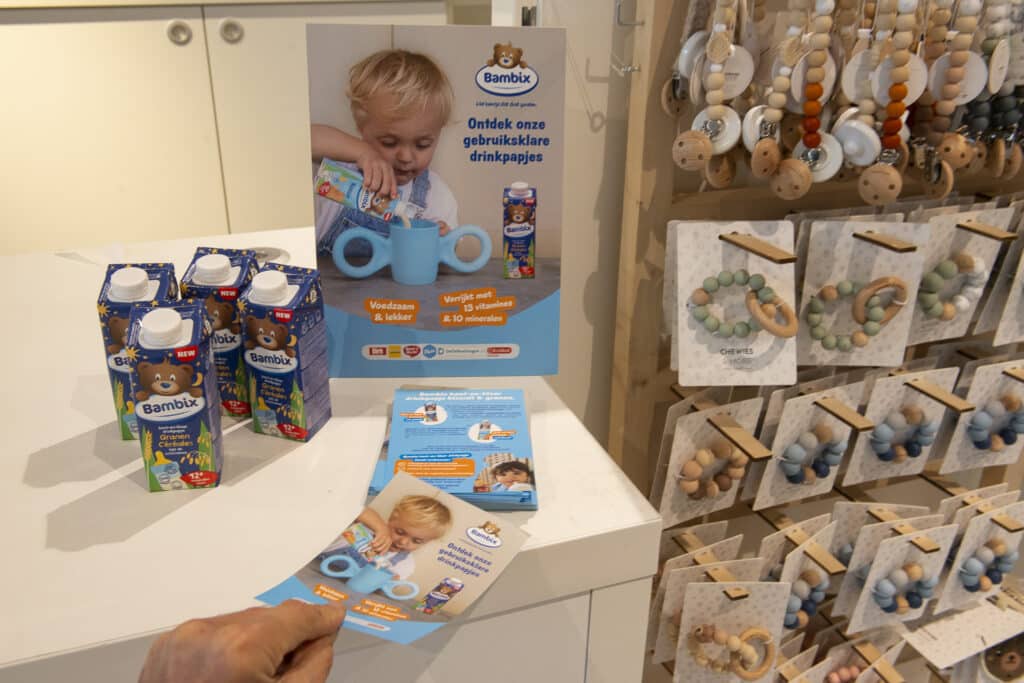 For this campaign, we distributed samples of Bambix drinking cereal through specialized baby stores. Large retailers such as Prénatal (in various cities including Amersfoort, Utrecht, and Breda) and Van Asten Babysuperstore were the ideal channel for reaching this specific target group in the right context. To reinforce the promotion on the shop floor, we developed eye-catching communication tools, including an A6 flyer and a counter display for the checkout.