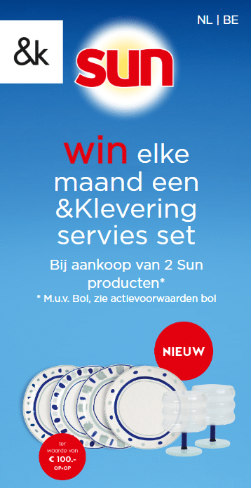 To celebrate this anniversary, we devised an activation campaign in which consumers had the chance to win a unique &Klevering x Sun Servies Set, consisting of four dessert plates and two glasses, every month. The threshold for participation was simple but effective: when purchasing two SUN products, consumers could upload their receipt via the special campaign website to compete for the prizes.